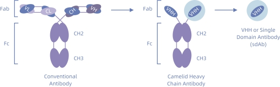 纳米抗体是由比利时科学家Hamers等1993年在《Nature》中首次报道,它是一种天然存在的仅由两条重链组成的特殊抗体,只含有重链可变区(VHH,Variable Domain of Heavy Chain Antibody)和两个常规的CH2与cH3区,该可变能单独稳定地在体外存在,是目前已知的可稳定结合目标的最小单位,VHH品体宽为2.5nm,长4nm,分子量仅为传统完整抗体的1/10(约15KD)但依然具有完整的抗原识别能力,因此称之为纳米抗体(Nanobody或single domain antibody)