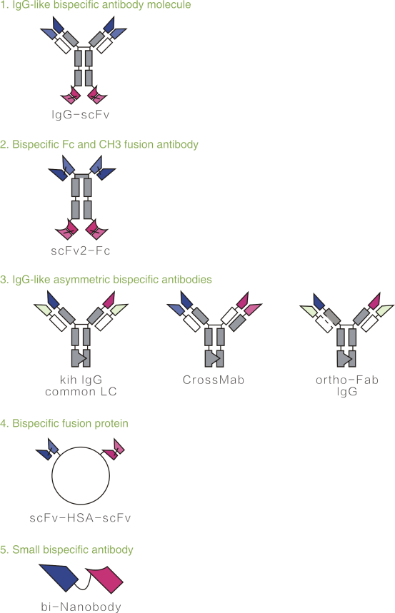 近年来,有多种形式的双特异性抗体被设计开发出来,主要根据是否有Fc结构分为IgG型和非IgG型两大类:IgG-like主要形式有Crossmab,Trionabs,kih-IgG等;非IgG-like主要形式有TandscFv,BiTE,DART,TandAb,F(ab’)2,bio-Nanobod等。