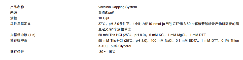 它们对于添加一个完全的Cap0结构都是必须的。在合适浓度的S-腺苷甲硫氨酸(S-Adenosylmethionine,SAM),鸟苷三磷酸(GTP)等条件存在下,牛痘病毒加帽酶能够将帽子结构(m7Gppp,Cap0)加到RNA5'端。本品可用于T7 RNA Polymerase催化的体外转录反应产生的RNA的加帽反应。