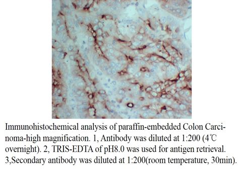 This antibody detects endogenous levels of human carcinoembryonic antigen(CEA). Heat-induced epitope retrieval (HIER) TRIS-EDTA of pH8.0 was highly recommended as antigen repair method in paraffin sec