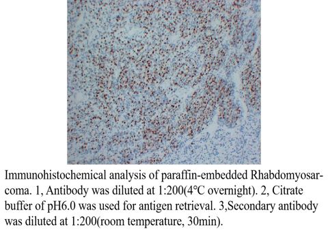 This antibody detects endogenous levels of human Myogenin. Heat-induced epitope retrieval (HIER) Citrate buffer of pH6.0 was highly recommended as antigen repair method in paraffin section