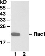 Western blot analysis of Rac1 proteins. MEF whole-cell lysate was used for western blots. The monoclonal anti Rac1 antibody was pre-incubated without (lane 1) or with (lane 2) the antigen protein (Rac1) to show the specificity.
